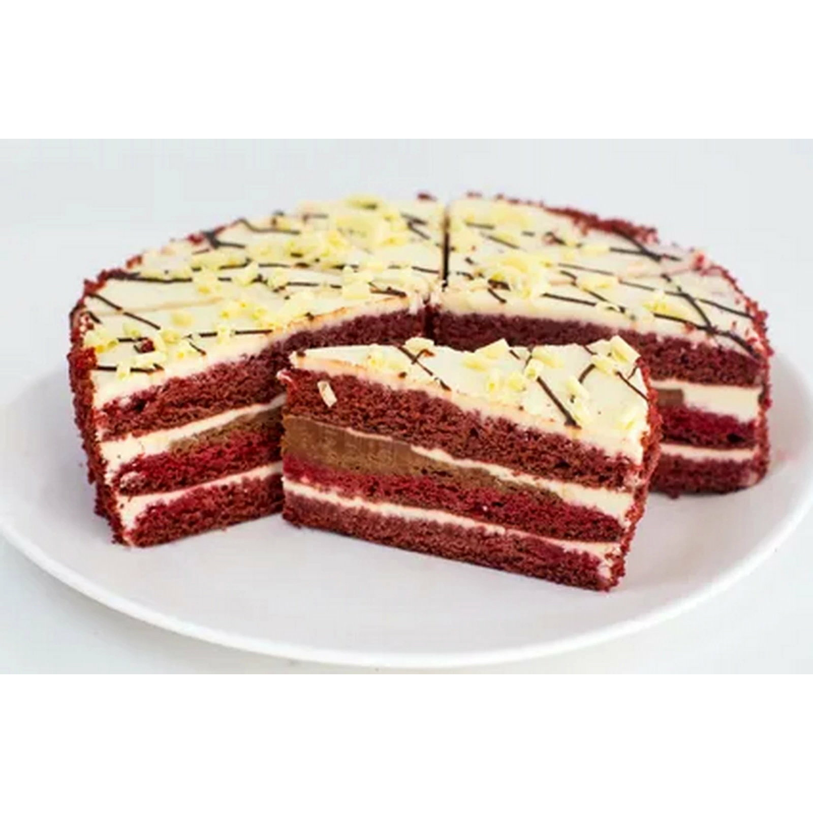 Бисквитные коржи красно-бордового цвета, пропитанные сиропом, прослоенные шоколадным ганашем и кремом на сыре Маскарпоне.