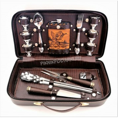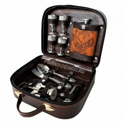 Состав набора Ложка столовая «Тройка» (нерж. сталь) 6 шт Вилка столовая «Тройка» (нерж. сталь) 6 шт Стопка  Rosenberg 6 шт Фляжка 0,3л обшитая натуральной кожей 1 шт Зажигалка 1 шт Нож  для мяса 1 шт Вилка для мяса 1 шт Шампура (нерж.) 6 шт
