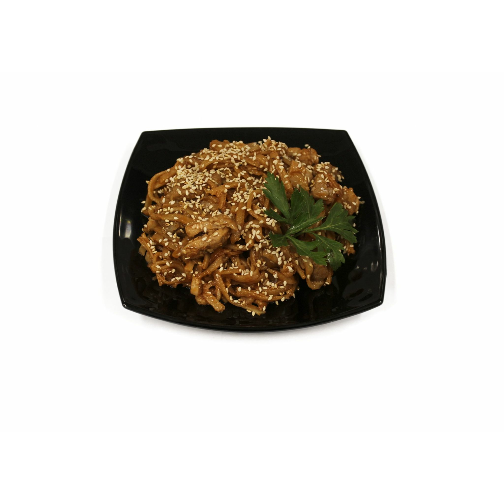 Лапша удон, куриное бедро, соус томатно-медовый, кунжут. Вес 360 гр.