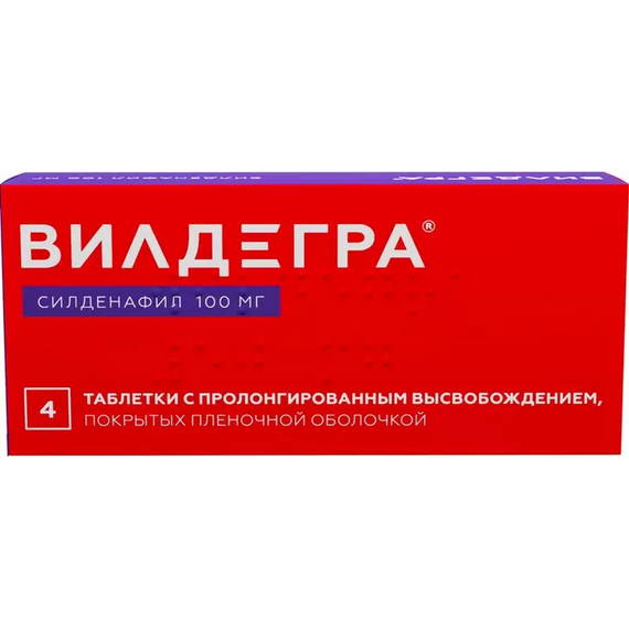 После однократного приема препарата Вилдегра® в дозе 100 мг средняя максимальная концентрация силденафила в плазме крови (Сmах) мужчин составляет около 411 нг/мл. стах силденафила при приеме препарата Вилдегра® внутрь натощак достигается в среднем в течение 2 ч.