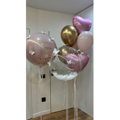 Набор из: • «стеклянный» шар с бабочками и декором • баблс с перьями и бабочками • 2 фольгированных сердца • 2 латексных шара • 3 хром золото Наличие уточняйте:)