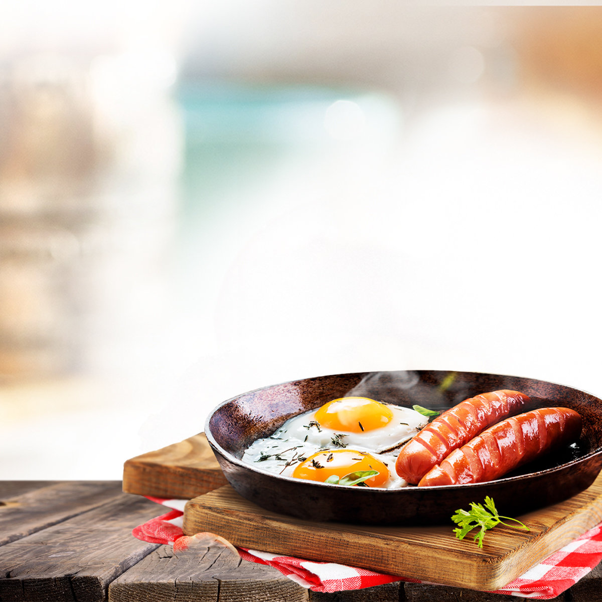 Яичница из двух яиц, куриная сосиска и соус на ваш выбор