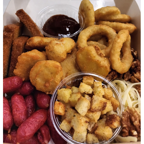 Колбаски пиколини,сыр косичка,крутоны,луковые кольца,нагетцы,гренки,орех грецкий,соус "Барбекью"