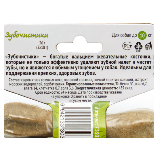 Зубочистики - это лучшие лакомства для чистки зубов на основе прессованной сыромятной кожи, отлично снимают зубной налет, предотвращают появление зубного камня и борются с болезнями десен. Запатентованная структура делает косточку достаточно жесткой, что обеспечивает максимально эффективную чистку зубов, сопоставимую с механической. Существенное содержание кальция укрепляет кости и зубы собаки. 100% натуральный состав и отсутствие любых искусственных ингредиентов способствует легкому усваиванию. Состав: сыромятная говяжья кожа, овощной крахмал, соевый лецитин, кальций, экстракт морских водорослей, сорбат калия.